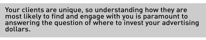 To begin, review your advertising options and map your customers against those channels. For example, if you’re thinking about print ads in local newspapers or magazines, consider where your clients might look. Similarly, sponsoring a local fun run versus TV or radio spots, or partnering with a community charity or nonprofit are all possibilities – the most cost effective choices are to go where your clients will find you. Your clients are unique, so understanding how they are most likely to see your presence and engage with you is paramount to answering the question of where to invest your advertising dollars.